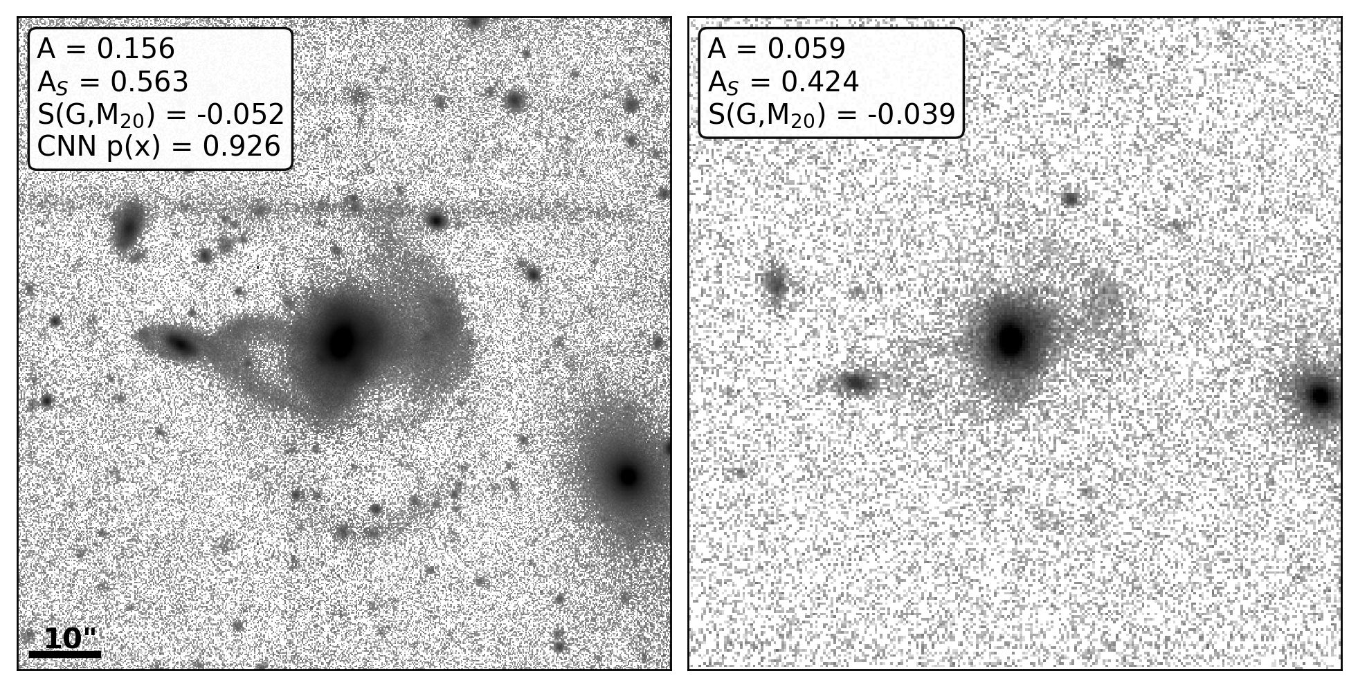 Here is a comparison of a UNIONS (left) and an SDSS (right) image of the same post-starburst galaxy, with relevant non-parametric morphology statistics for post-merger identification labelled.