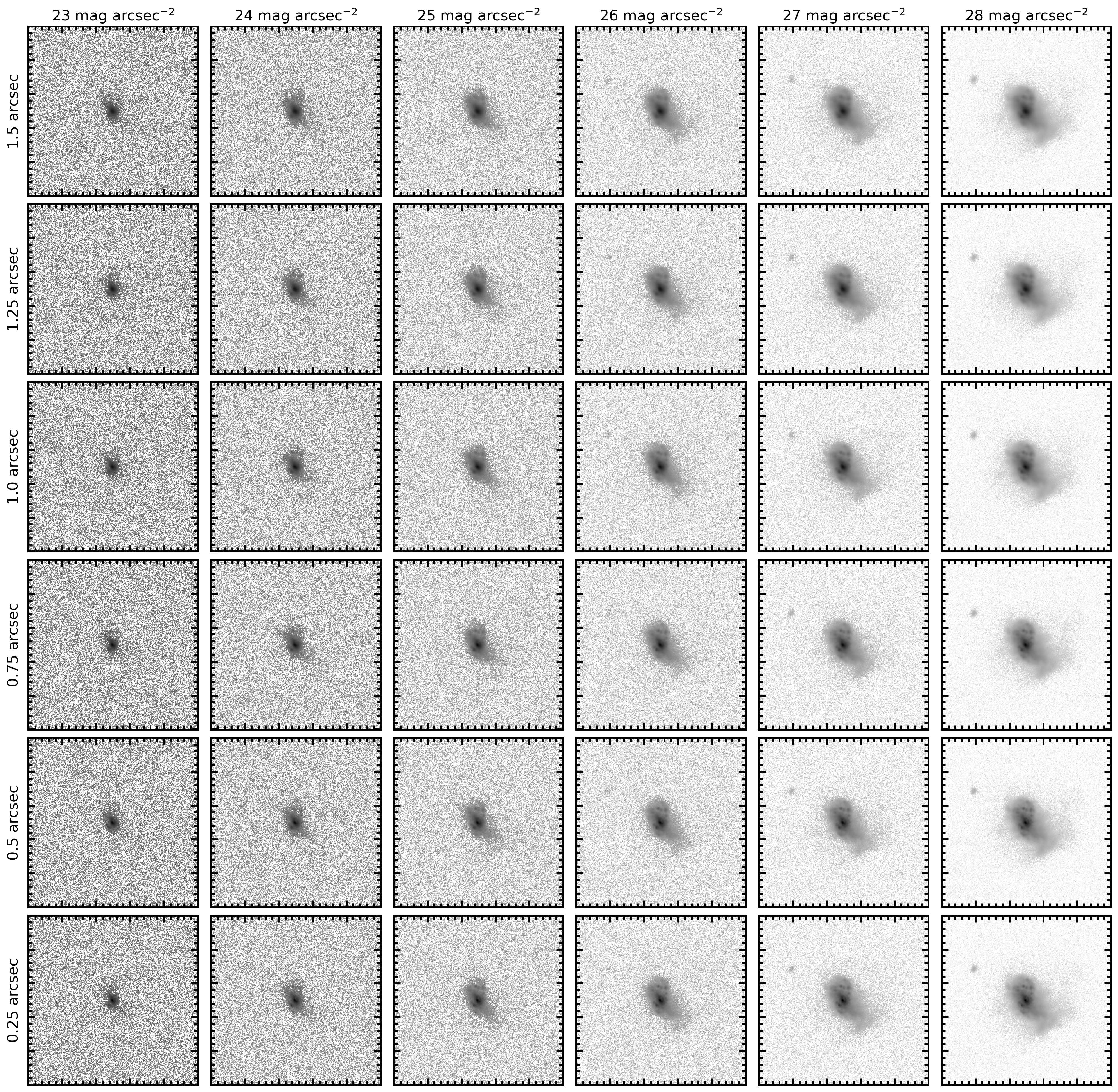 Below is an example of one IllustrisTNG100-1 post-merger galaxy simulated at 36 different image qualities from my most recent paper. The data used to generate this image is publicly available and can be found here.